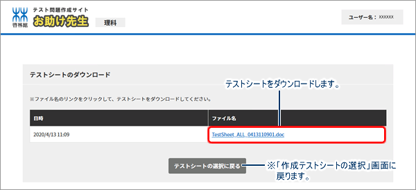 [テストシートの選択に戻る]をクリックすると,「作成テストシートの選択」画面に戻ります。